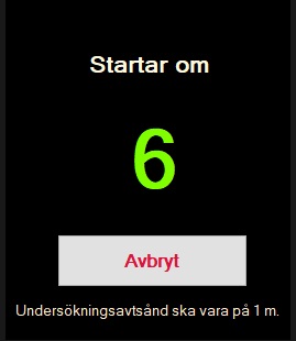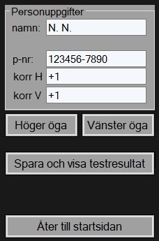 Testet startar automatisk efter några sekunder. Se till att muspekaren inte ligger kvar på skärmen! Om någon prick missas, så gör systemet ett automatiskt omtest. När första ögats test är klar kommer testmenyn tillbaka på skärmen, klicka då på andra ögats knapp. När båda ögonen är testade, klicka på knappen Spara och visa resultat. Det aktuella testresultatet visas då på skärmen.